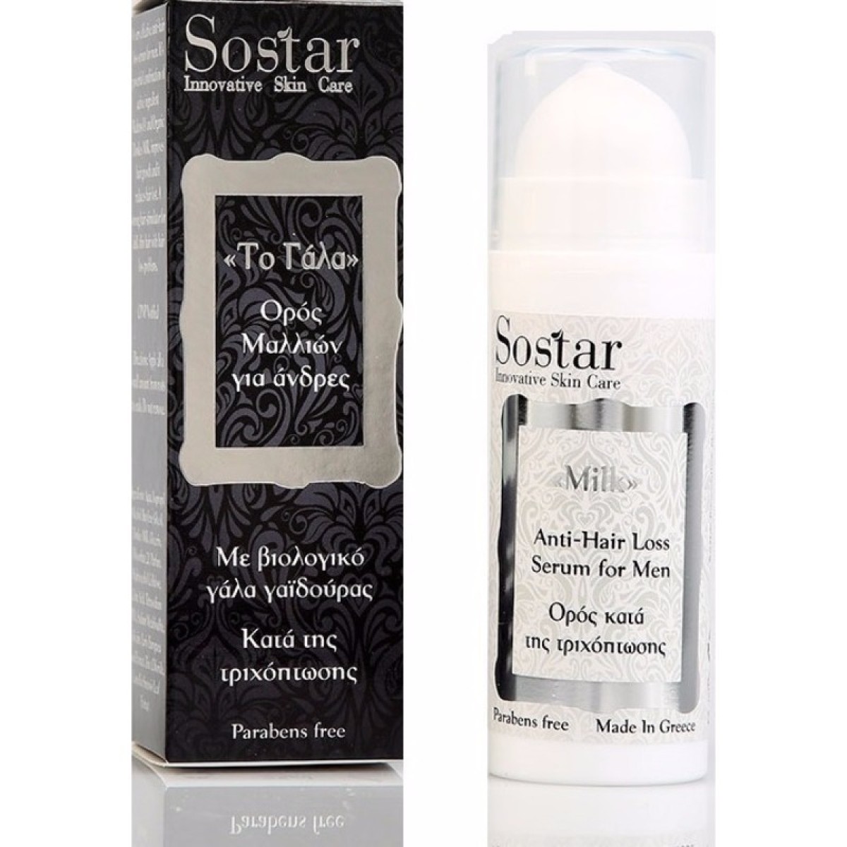Sostar | Hair Serum for Men | Ορός Mαλλιών Kατά της Tριχόπτωσης για Άνδρες "Το Γάλα" | 25ml Ορός Mαλλιών Kατά της Tριχόπτωσης για Άνδρες "Το Γάλα" Ορός Mαλλιών Kατά της Tριχόπτωσης για Άνδρες "Το Γάλα" Η υψηλή περιεκτικότητα του στο καινοτόμο δραστικό συστατικό Redensyl® και το βιολογικό γάλα γαϊδούρας αναδομούν την τρίχα αποτελεσματικά και προωθούν την γρήγορη ανάπτυξη της. Δρα κατά της τριχόπτωσης άμεσα και ενισχύει την τριχοφυΐα. 25ml...